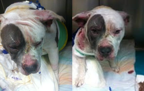 Her clueless guardian created a makeshift doghouse in the backyard, and added a space heater in the mistaken notion that this would solve the problem by helping to keep them all warm. Sad to say, this ridiculous construct resulted in a tragic fire that not only killed the two helpless puppies, but also resulted in horrific burn injuries to poor Lucy, on whom the burning doghouse and adjacent fence fell, searing the melting tarp into the skin on her body.